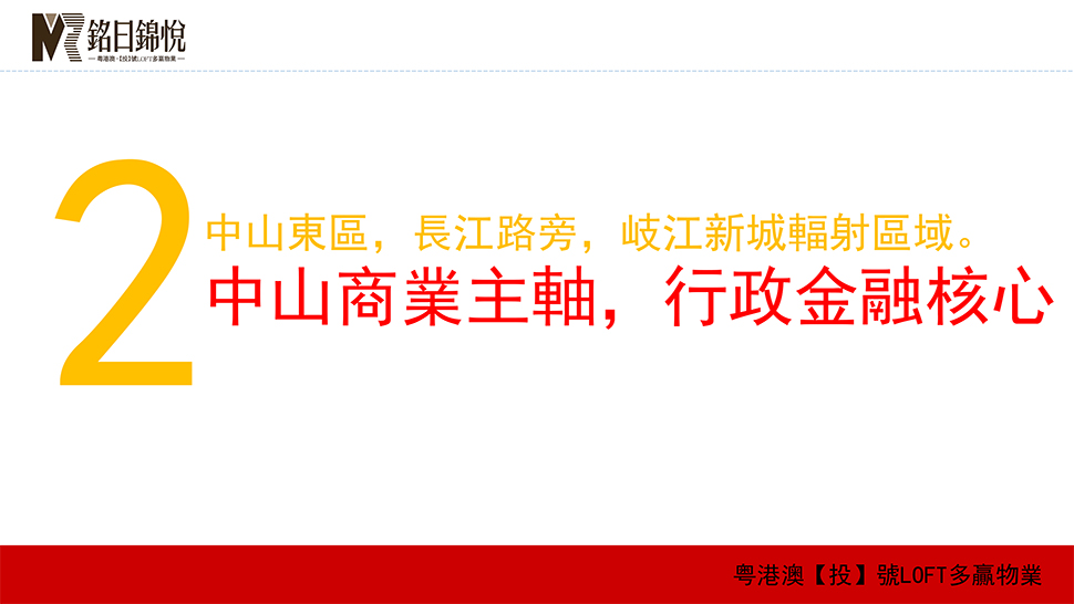 【铭日锦悦】项目位于中山市东区鳌长公路 33 号,处于中山路、长江路双轴交汇处,是中山市东区中心核心位置,处于行政经济的中心,未来发展潜力巨大,人口稠密,生活氛围浓郁,商业繁荣。